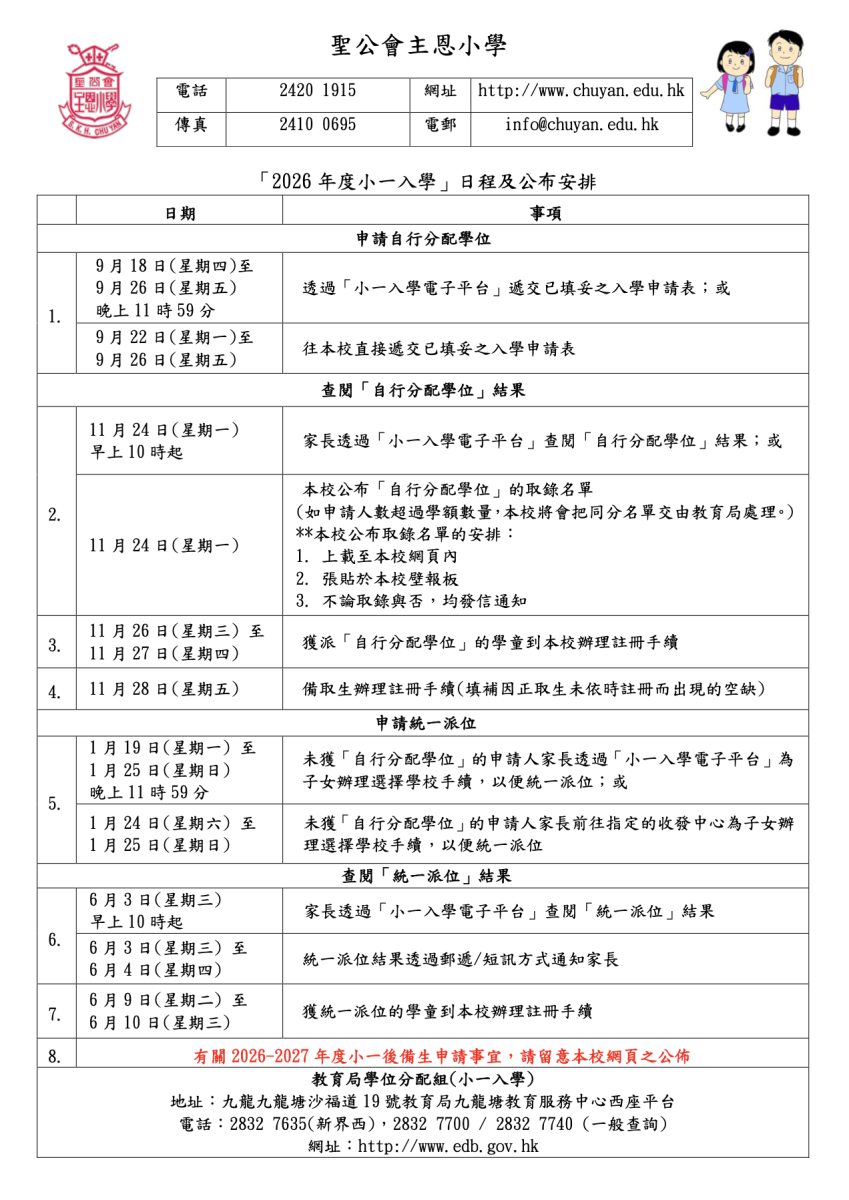 「2026-2027年度小一入學自行分配學位」申請事宜